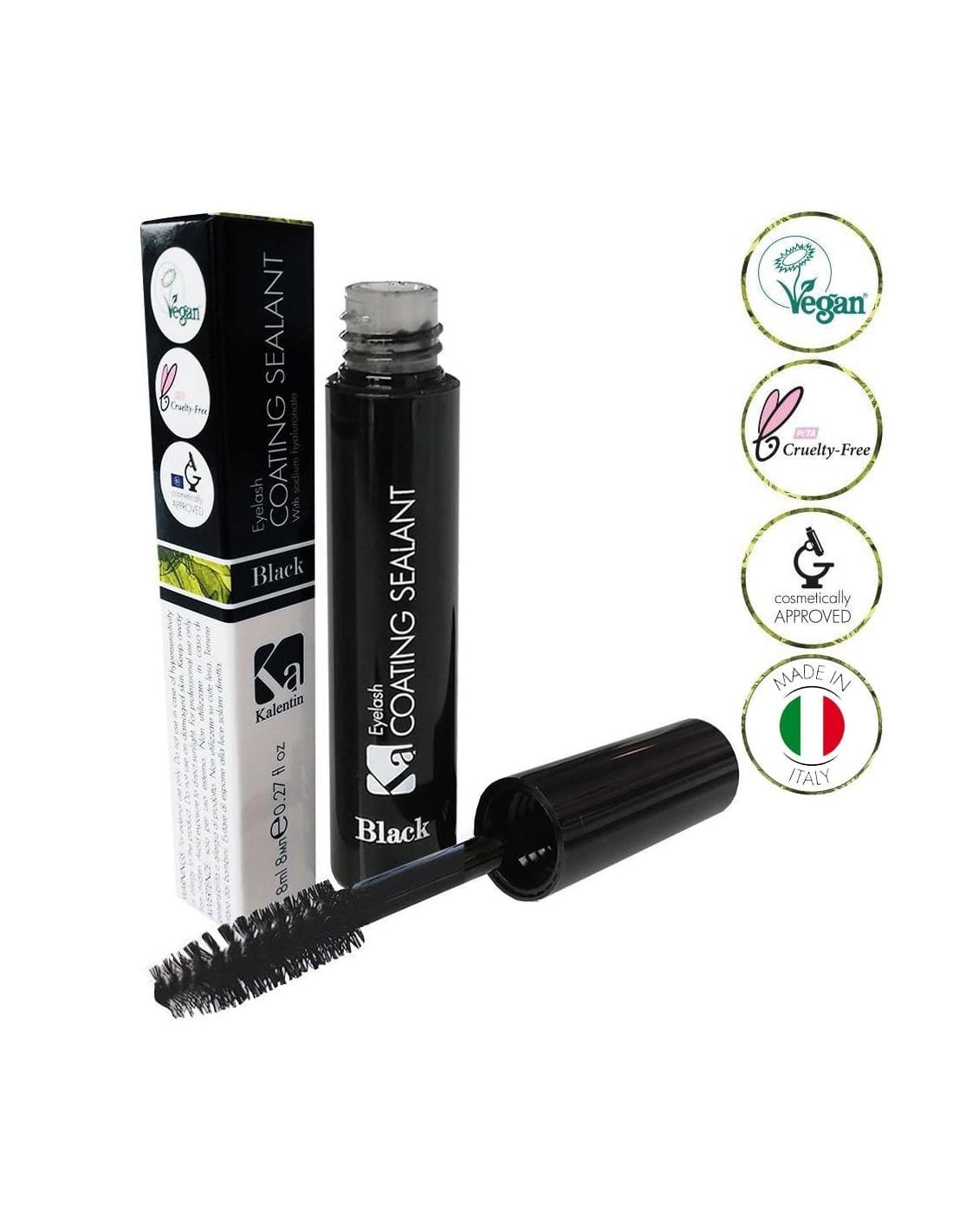 Kalentin Coating Sealant 8 ml BLACK gör att fransarna ser fräscha ut och förlänger ögonfransförlängningens livslängd genom att täcka ytan tunt. Applicera när limmet är helt torrt i mitten av längderna till fransarna.